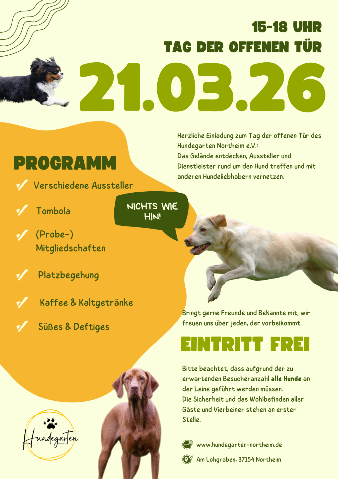 Herzliche Einladung zum Tag der offenen Tür im Hundegarten Northeim e.V. am 21. März 2026 von 15:00 bis 18:00 Uhr. Der Eintritt ist für alle frei.